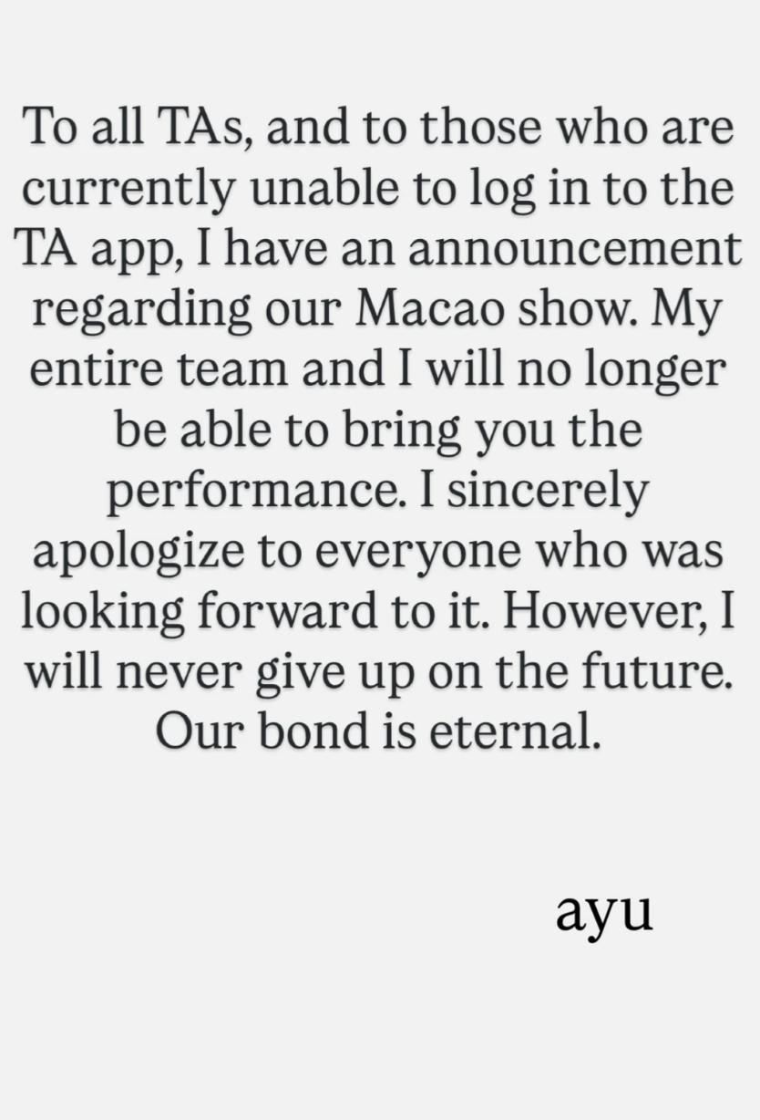 今天必须向大家传达一个非常痛苦、令人心碎的消息。原定日的澳门公演,经过多方协商,由于种种原因,我们收到了中止的通知。继上海公演之后,再次给各位带来极大的悲伤和不便。向各位粉丝致以最诚挚的歉意,同时承诺一定会创造再次相见的机会。